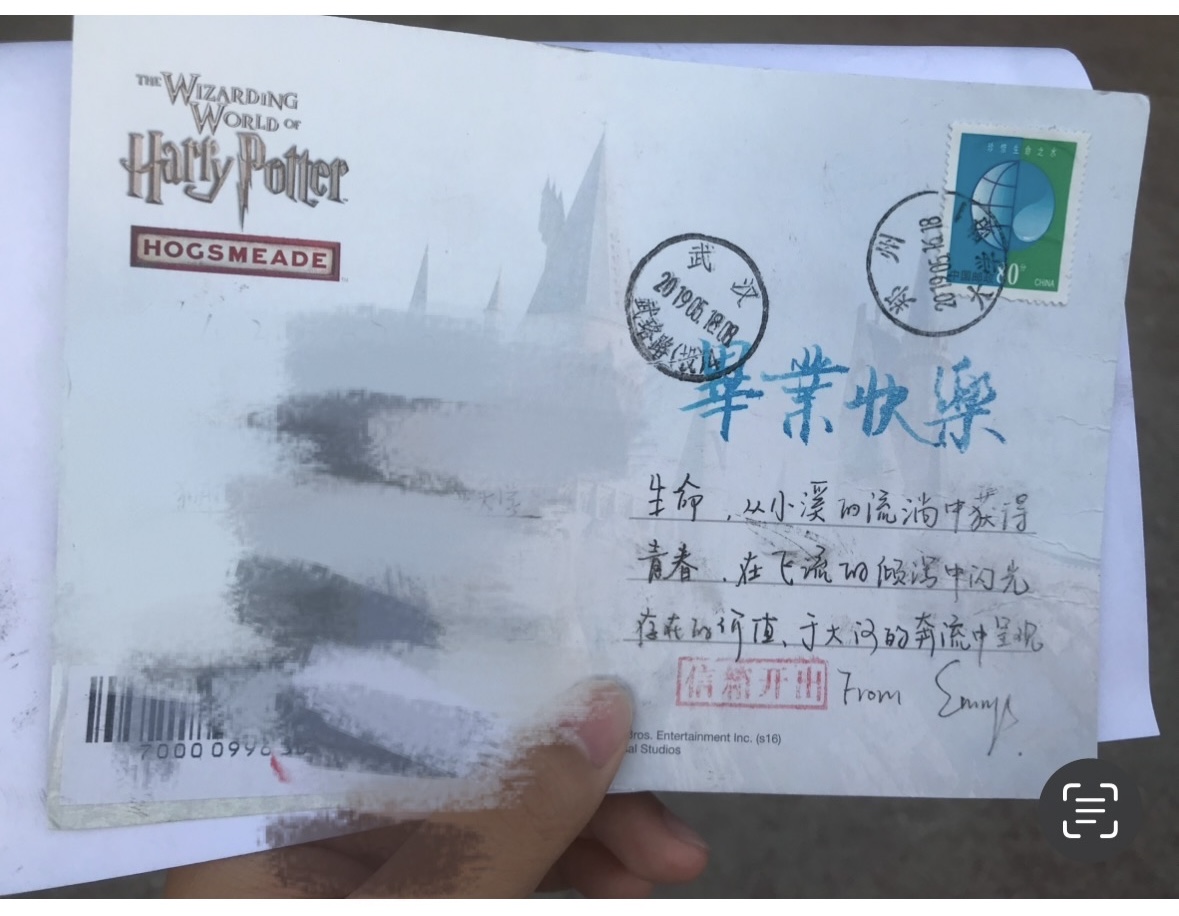 突然在群聊里聊起一个网友的字很好看,然后想起来很多年前在我毕业那年他有往我学校里给我寄明信片,祝我毕业快乐。信件分发到学校后会派到院办,然后一般是院办更新学校院官网通知学生。已经不记得是从哪里看到了消息或者怎么被通知到我有一个明信片收件的,只记得去院主楼领信件的时候特别开心。现在回想起来,这张明信片就是我本科毕业的那个夏天最闪光的标记,也是我为数不多的精神财富。它需要被存档。「生命,从小溪的流淌中获得;青春,在飞流的倾泻中闪光;存在的价值,于大河的奔流中呈现」明信片